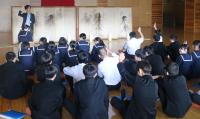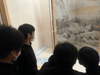 令和6年能登半島地震・令和6年奥能登豪雨復興支援事業「ひと,能登,アート」教育普及事業として,東京国立博物館から3名の方に来校していただき,「見て,感じて,楽しむ松林図屏風」を行いました。真っ暗にした卓球場にろうそくの明かりを模した照明をあてた松林図屏風(複製)が展示され,生徒たちは息をのんで見入っていました。