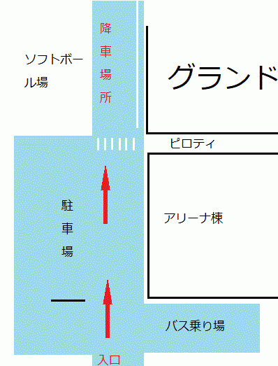 生徒を降ろす際は、体育館ピロティ前を通り抜けて、野球場・ソフトボール場付近で降ろすようご協力お願いします。