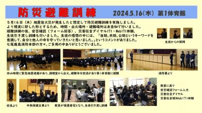 避難訓練の後、安否確認(フォーム回答)、災害伝言ダイヤル171・Web171体験、生徒引き渡し訓練も行いました。