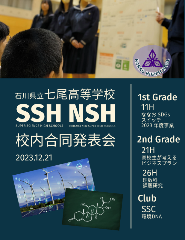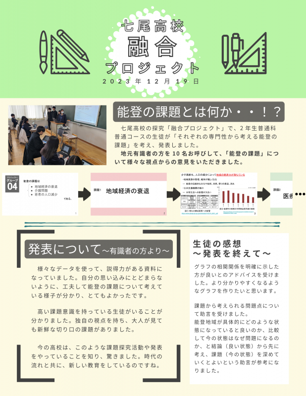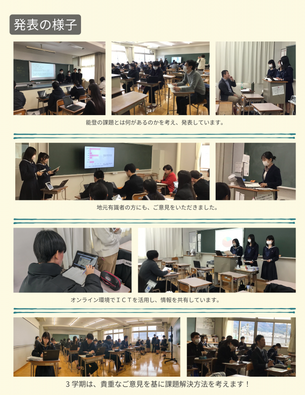 12月19日に地元有識者の方をお呼びして、普通科普通コースの生徒が考えた能登の課題についてプレゼンテーションを行いました。