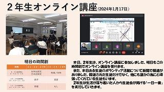 本日、2年生は、オンライン講座に参加しました。明日もこの時間割でオンライン講座を受けます。また、本日ある生徒のボランティア活動について新聞で報道がありました。報道された生徒だけでなく、他にも誰かの為にと頑張ってくれている生徒もいます。2年生は生活が落ち着いた人から生徒会が掲げる「一日一善」を実行していきます。