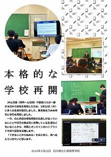 2024年1月22日 17時51分本日より、部活動を含め本格的に学校を再開しました。JR七尾線(羽咋~七尾間)や路線バスの一部が運転を再開したことから、多くの生徒が登校しました。