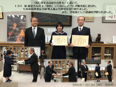 2023年11月16日 12時27分「税に関する高校生の作文」優秀賞・学校賞 受賞!