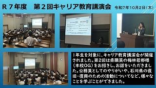 1年生を対象に、キャリア教育講演会が開催されました。第2回は県職員の梅林若那様(本校OG)をお招きし、お話をいただきました。公務員としてのやりがいや、石川県の復旧・復興のための活動についてなど、様々なことを学ぶことができました。