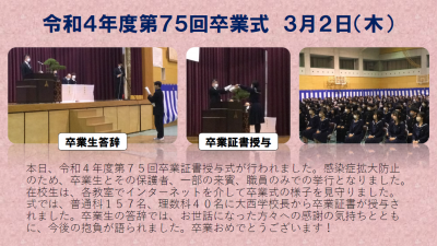 2023年3月2日 18時35分本日、令和4年度第75回卒業証書授与式が行われました。感染症拡大防止のため、卒業生とその保護者、一部の来賓、職員のみでの挙行となりました。在校生は、各教室でインターネットを介して卒業式の様子を見守りました。式では、普通科157名、理数科40名に大西学校長から卒業証書が授与されました。卒業生の答辞では、お世話になった方々への感謝の気持ちとともに、今後の抱負が語られました。卒業おめでとうございます!