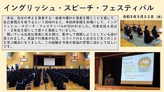 2023年3月23日 10時57分本日、自分の考えを発表する・他者の優れた発表を聞くことを通して、自己表現力を育てるという目的のもと、本校体育館を会場にして、イングリッシュ・スピーチ・フェスティバルが行われました。代表生徒6名は1・2年生を前にして堂々と発表していました。