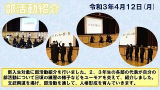 新入生対象に部活動紹介を行いました。2、3年生の各部の代表が自分の部活動について日頃の練習の様子などをユーモアを交えて、紹介しました。