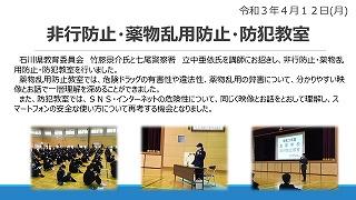 石川県教育委員会 竹藤景介氏と七尾警察署 立中亜依氏を講師にお招きし、非行防止・薬物乱用防止・防犯教室を行いました。
