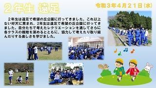 令和3年4月21日(水)、2年生は遠足で希望の丘公園に行ってきました。これ以上ない好天に恵まれ、2年生は遠足で希望の丘公園に行ってきました。自分たちで考えたレクリエーションを通してさらに各クラスの親睦を深めるとともに、協力して考えたり取り組んだりする楽しさを学びました。