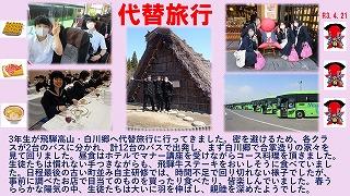 3年生が飛騨高山・白川郷へ代替旅行に行ってきました。密を避けるため、各クラスが2台のバスに分かれ、計12台のバスで出発し、まず白川郷で合掌造りの家々を見て回りました。昼食はホテルでマナー講座を受けながらコース料理を頂きました。生徒たちは慣れない手つきながらも、飛騨牛ステーキをおいしそうに食べていました。日程最後の古い町並み自主研修では、時間不足で回り切れない様子でしたが、事前に調べたお店で目当てのものを買ったり食べたり、皆楽しんでいました。春うららかな陽気の中、生徒たちは大いに羽を伸ばし、親睦を深めたようでした。