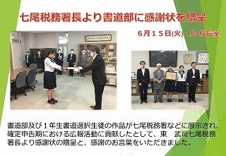 七尾税務署長より書道部に感謝状を贈呈