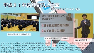 4月10日(水)7限目に石川県教育委員会事務局学校指導課の池田先生を講師としてお招きし、非行防止教室を開催しました。SNSへの投稿や使用が様々な危険につながり、いじめや人権侵害にもつながることを学びました。「被害者と加害者、双方にとって1枚の撮影で十分に危険である」ことを、最近の事例を通して確認するいい機会となりました。ネット社会を生きる七高生に、「書き込む前にRETHINK」「まずは周りに相談」を実践することの大切さを教えていただきました。