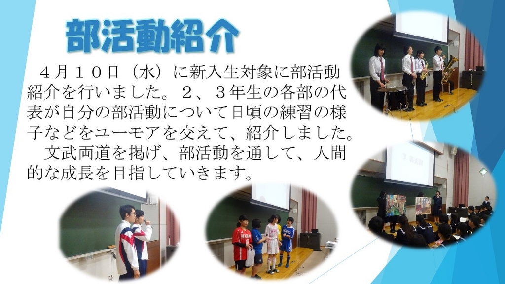 4月10日(水)に新入生対象に部活動紹介を行いました。2、3年生の各部の代表が自分の部活動について日頃の練習の様子などをユーモアを交えて、紹介しました。文武両道を掲げ、部活動を通して、人間的な成長を目指していきます。