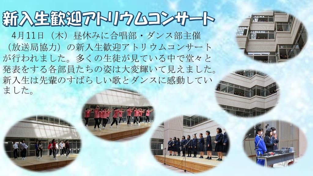 4月11日(木)昼休みに合唱部・ダンス部主催(放送局協力)の新入生歓迎アトリウムコンサートが行われました。多くの生徒が見ている中で堂々と発表をする各部員たちの姿は大変輝いて見えました。新入生は先輩のすばらしい歌とダンスに感動していました。