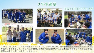 4月17日(水)に3年生の遠足が行われました。天候に恵まれ、羽咋駅から眉丈台地緑地自然公園までの道のりを歩きました。クラス全員でBBQの準備や後片付けをすることを通して各クラスの絆が深まり、笑顔の絶えない楽しい遠足となりました。