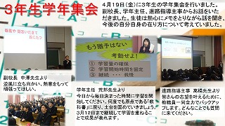 4月19日(金)に3年生の学年集会を行いました。副校長、学年主任、進路指導主事からお話をいただきました。生徒は熱心にメモをとりながら話を聞き、今後の自分自身の在り方について考えていました。