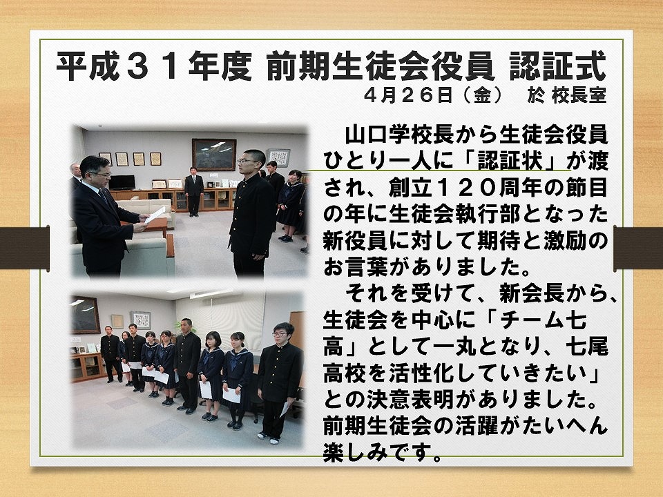 山口学校長から生徒会役員ひとり一人に「認証状」が渡され、創立120周年の節目の年に生徒会執行部となった新役員に対して期待と激励のお言葉がありました。それを受けて、新会長から、生徒会を中心に「チーム七高」として一丸となり、七尾高校を活性化していきたい」との決意表明がありました。前期生徒会の活躍がたいへん楽しみです。