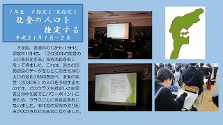 3学期,普通科の12H~15Hと理数科16Hは,「2030年の能登の人口を推定する」探究活動をおこなってきました。これは,過去の国勢調査のデータをもとに能登地域の人口の変化の傾向を調べ,未来の能登(2030年)の人口を予想するものです。どのクラスも推定した結果を2月中旬までにパワーポイントにまとめ,クラスごとに発表会をおこないました。本年度の探究の取り組みが活かされた発表会になりました。