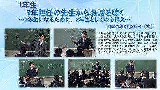3年生の担任としてこれまで生徒と共に戦ってきた先生方に、大学入試に向けて、2年生を目前に控える今の時期だからこその心構えや各教科の視点からの具体的な学習方法など、熱をこめてお話していただきました。新2年生にとって「受験に向けて本気にならないといけない」と覚悟を持つきっかけになったのではないでしょうか。