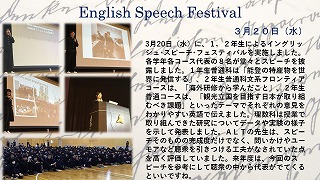 3月20日(水)に、1,2年生によるイングリッシュ・スピーチ・フェスティバルを実施しました。各学年各コース代表の8名が堂々とスピーチを披露しました。1年生普通科は「能登の特産物を世界に発信する」、2年生普通科文系フロンティアコースは、「海外研修から学んだこと」、2年生普通コースは、「観光立国を目指す日本が取り組むべき課題」といったテーマでそれぞれの意見をわかりやすい英語で伝えました。理数科は授業で取り組んできた研究についてデータや実験の様子を示して発表しました。ALTの先生は、スピーチそのものの完成度だけでなく、問いかけやユーモアなど聴衆を引きつける工夫がなされていた点を高く評価していました。来年度は、今回のスピーチを参考にして聴衆の中から代表がでてくるといいですね。