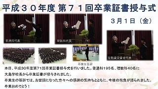 本日、平成30年度第71回卒業証書授与式を行いました。普通科195名、理数科40名に