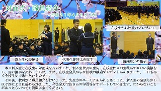 本日新入生と在校生の対面式を行いました。新入生代表の生徒・在校生代表の生徒がお互いに挨拶をし、固い握手を交わしました。また、在校生全員からは校歌の歓迎プレゼントがありました。一日も早く全校生徒で歌いたいものです。