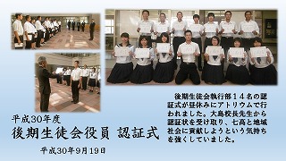 2018年9月19日 17時21分平成30年度の後期生徒会執行部14名の認証式が9月19日水曜日の昼休みにアトリウムで行われました。大島校長先生から認証状を受け取り、七高と地域社会に貢献しようという気持ちを強くしていました。
