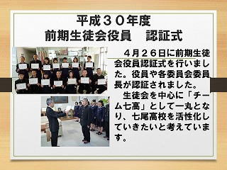 4月26日に前期生徒会役員認証式を行いました。役員や各委員会の委員長が認証されました。生徒会を中心に「チーム七高」として一丸となり、七尾高校を活性化していきます。