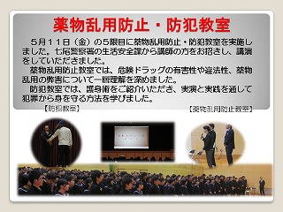 5月11日(金)の5限目に薬物乱用防止教室・防犯教室を実施しました。七尾警察署の生活安全課から講師をお招きし、講演をしていただきました。薬物乱用防止教室では危険ドラッグの恐ろしさについて身近な動画を通して一層理解を深めました。防犯教室では護身術をご指導いただき、実演を交えて実践的に学ばせていただきました。