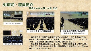本日新入生と在校生の対面式が行われました。新入生代表の生徒・在校生代表の生徒がお互いに挨拶をし、固い握手を交わしました。その後、在校生全員で校歌を歌い新入生を歓迎しました。対面式後に職員紹介を行いました。1年生はまだ緊張している様子でしたが、先生方のユーモア溢れる職員紹介に表情もほぐれ、笑いの絶えない時間となりました。