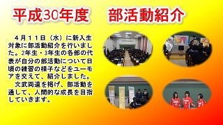 新入生を対象に部活動紹介を行いました。2年生・3年生の各部の代表が、普段の練習の様子を紹介しました。文武両道で、人間的な成長を全校挙げて目指していきます。