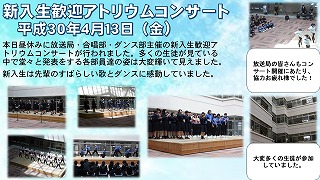 本日昼休みに放送局・合唱部・ダンス部主催の新入生歓迎アトリウムコンサートが行われました。多くの生徒が見ている中で堂々と発表をする各部員達の姿は大変輝いて見えました。