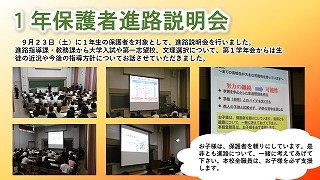 9月23日(土)に1年生の保護者を対象として、進路説明会を行いました。進路指導課・教務課から大学入試や第一志望校、文理選択について、第1学年会からは生徒の近況や今後の指導方針についてお話させていただきました。