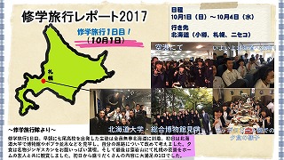 修学旅行1日目。早朝に七尾高校を出発した生徒は全員無事北海道に到着。初日は北海道大学で博物館やポプラ並木などを見学し、自分の進路について改めて考えました。夕食は名物ジンギスカンをお腹いっぱい満喫。そして最後は藻岩山にて札幌の夜景をホームの友人と共に観賞しました。初日から盛りだくさんの内容に大満足の1日でした。