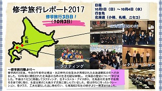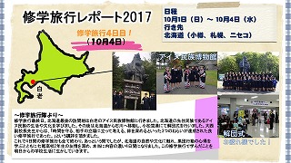 修学旅行2日目。午前中は大倉山スキージャンプ台、白い恋人パークへ行きました。実際にオリンピックが行われた大きなジャンプ台、実際に白い恋人が作られている素敵な工場など、石川で決して見ることの出来ない“本物”に触れ、生徒は大興奮の様子でした。午後からは小樽と札幌で班別自主研修。班員と協力し合い様々なところを訪れ、見て、聞いて、体験して、食べて、北海道を全身で感じ、楽しんでいました。