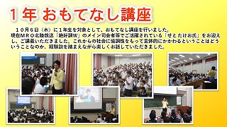 10月6日(木)に1年生を対象として、おもてなし講座を行いました。現在MRO北陸放送「絶好調W」のメイン司会者等でご活躍されている「せと たけお氏」をお迎えし、ご講義いただきました。これからの社会に協調性をもって主体的にかかわるということはどういうことなのか、経験談を踏まえながら楽しくお話していただきました。