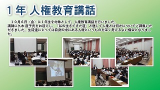 10月6日(金)に1年生を対象として、人権教育講話を行いました。講師に久木 直子氏をお迎えし、「私の生きてきた道」と題して人権とは何かについてご講義いただきました。生徒達にとっては自身の中にある人権というものを深く考えるよい機会となりました。