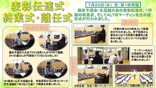 7月20日(水)に第一体育館にて、国体予選会・北信越大会の表彰伝達式と1学期の終業式、そしてALTのマーティン先生の離任式が行われました。