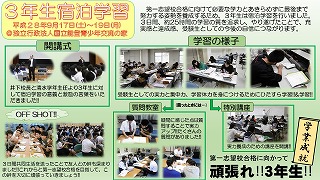 この合宿は第一志望校合格に向けて、受験生である3年生が必要な学力とあきらめずに最後まで努力する姿勢を養成するた目的で行われました。3年生たちは、3日間、約25時間の学習の質を追求し、学習をやり遂げたことで、充実感と達成感、受験生としての今後の自信につなげることができました。