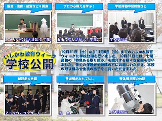 10月31日(土)から11月6日(金)のいしかわ教育ウィークに合わせて、学校公開を行いました。また、10月31日には、保護者や地域のみなさまに本校の「特色ある取り組み」を紹介するため、様々な企画を催しました。