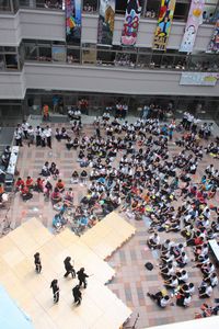 2日目、3日目の文化祭では、各クラスが制作した垂れ幕がアトリウムを飾り、生徒玄関前や、各クラスでは屋台が並びました。