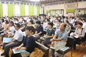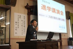 8月27日(土)PTA講演会が行われました。講演会に先立ち、本校の卒業生に現在の大学生活と高校生活での勉強方法などを話していただきました。講演会では、河合塾中部営業部 樋口 文紀氏をお招きし、「大学・学部を選ぶために知っておくべきこと」についてお話していただきました。200名を越える保護者の皆さんに出席していただきました。