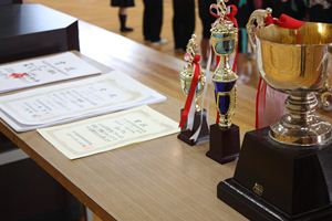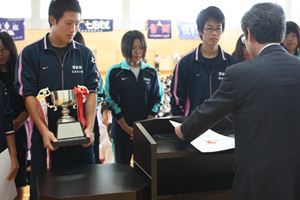 陸上、卓球女子、ソフトテニス部男女、ボート部男女、空手道部女子、放送局が登壇し、優勝旗、賞状を校長先生に渡し、披露して頂きました。