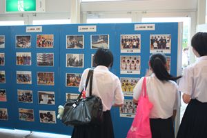 会場内フロアでの本校を紹介する写真や生徒の作品展示の様子。