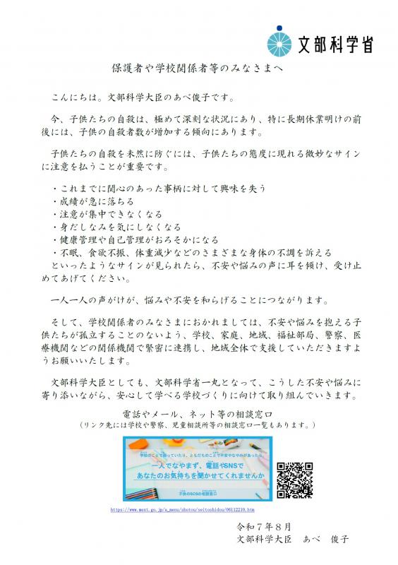 この度、文部科学大臣より、全国の保護者・学校関係者等へ向けたメッセージが送付されましたので、お知らせします。