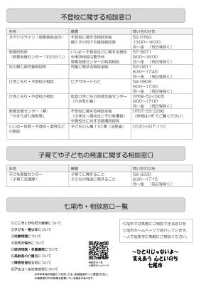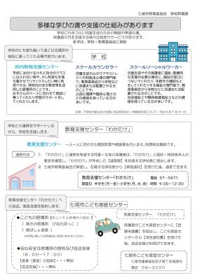 以下に七尾市教委作成の(お知らせ)「多様な学びの場や支援の仕組みがあります」を添付しましたのでご覧ください。