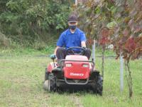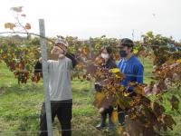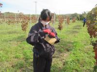 実習ではワイン用ブドウの栽培方法の説明を聞き、食用ブドウとの違いについで学び、鳥対策のための釣り糸を外す作業や、乗用モアーを使った除草を行いました。