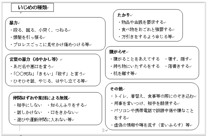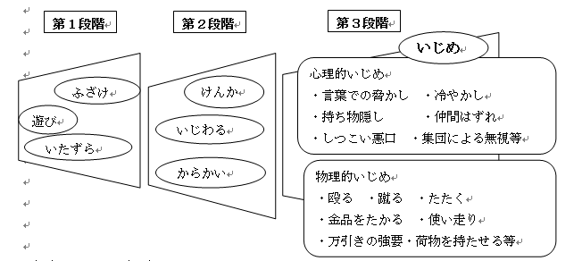 個々の行為が「いじめ」に当たるか否かの判断は、表面的・形式的に行うことなくいじめられた児童生徒の立場に立って行うものとする。なお、起こった場所は学校の内外を問わない。