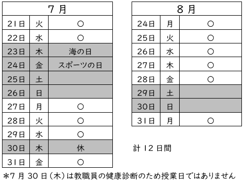 さて、各報道でもご承知のとおり、県立学校では臨時休校中に伴う児童生徒の学習の遅れを取り戻すために、7月21日からの夏季休業中に授業日を設けることとなりました。つきましては、本校でも下記のとおり授業日を設けますので、ご理解とご協力をお願いします。