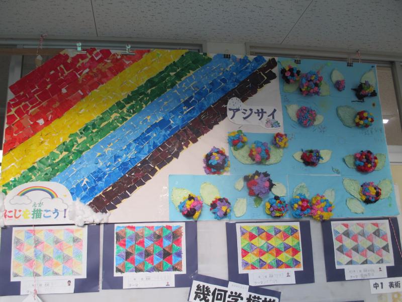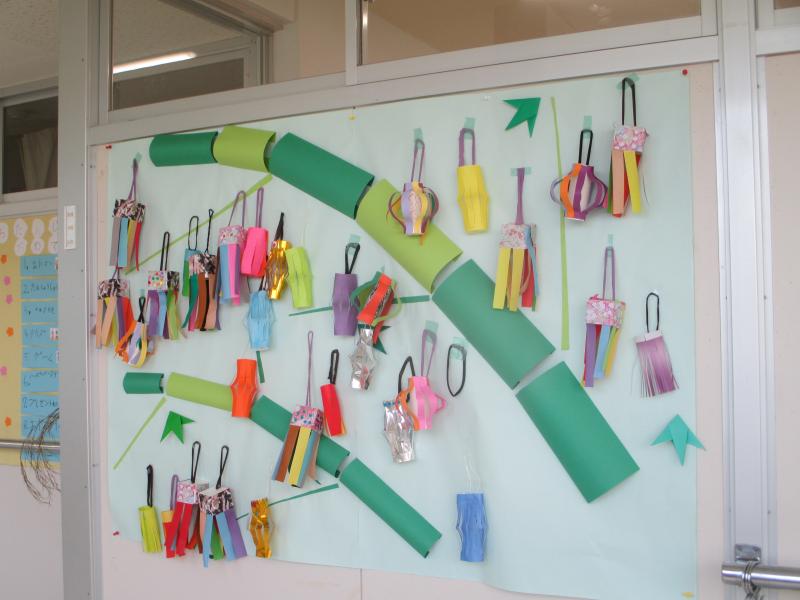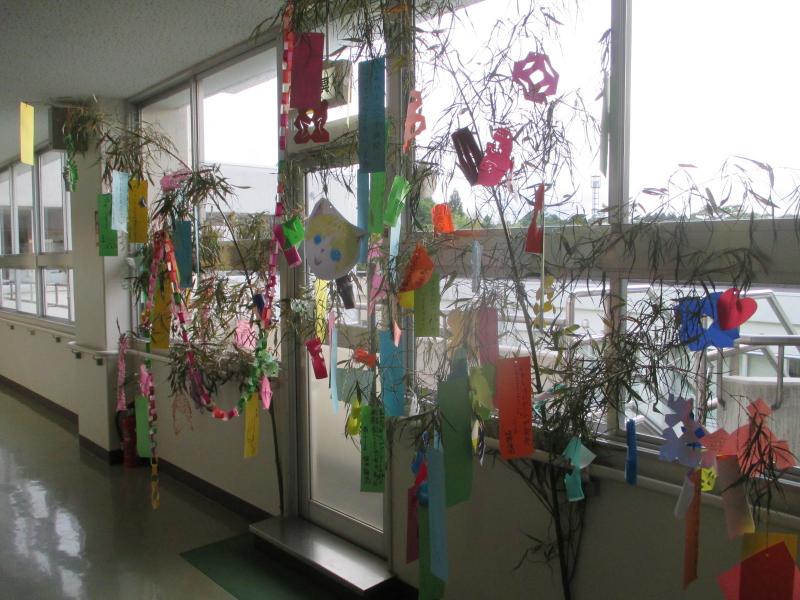 校内は七夕飾りや涼しげな初夏の掲示で、とても素敵になっています。笹飾りには、たくさんの願い事が書いてあります。色鮮やかな虹と紫陽花の花がにぎやかです。小学部廊下には、水族館から大きなジンベイザメもやってきて泳いでいます。